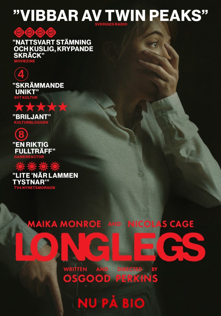 Maika Monroe gör ett fint jobb som agenten som utreder. Utmärkta biroller spelas av Alicia Witt samt Kiernan Shipka, riktigt lysande stjärnor. Men Cage snor hela showen. Handlingen är väldigt intresseväckande, engagerande, fascinerande. Men med brister. Man har lagt ner mycket tid på det estetiska, scenografin, detaljer. Och desto mindre på helheten, själva ploten/handlingen, hur allt hör ihop. Så resultatet blir därför väldigt spritt. En rörig film med en oviss tomhet kvarstår. Men med flera skrämmande scener och flera fantastiska skådis-insatser. Regin samt manus står Osgood Perkins för förresten, Anthony Perkins son, och har regisserat flera bra filmer innan denna, bl.a ”Gretel & Hansel” (2020) som var en stor favorit för mig. Och ”Longlegs” ger ju intryck men hur filmen slutade var lite väl platt för mig. Tomt och något intetsägande och lite väl otroligt kände jag. Rörigt och tomt. Säcken på handlingen knöts inte ihop helt rätt. Lite synd på en så intressant idé. Men ändå sevärd film. Främst tack vare Cage. Och den groteska sminkningen..